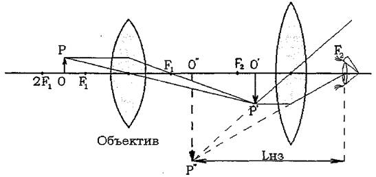 Рассматриваемый предмет ОР помещается перед фокусом объектива F1 в непосредственной близости от него. Объектив дает увеличенное, действительное, перевернутое изображение предмета О'Р', которое рассматривается через окуляр как через лупу. Изображение О'Р' располагается между окуляром и его фокусом F2 на небольшом расстоянии от него. В этом случае получается прямое, увеличенное, мнимое изображение 0"Р", которое рассматривается глазом. Положение окуляра подбирается так, чтобы расстояние от изображения до глаза равнялось расстоянию наилучшего зрения Lнз т.е. наименьшему расстоянию, на котором предмет можно рассматривать без утомления. Для нормального глаза Lнз = 25 см.