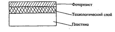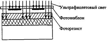 (фотошаблон - стеклянная пластина с нанесённым на неё непрозрачным плёночным рисунком). На операции экспонирования слой фоторезиста засвечивают через фотошаблон ультрафиолетовым светом: