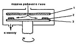 В реакторе ВЧ-полем возбуждается газоразрядная плазма между двумя параллельными электродами, расположенными на расстоянии 15 - 40 мм друг от друга. Пластины находятся в области газового разряда. Для равномерного травления подложкодержатель вращают с частотой 0,1 об./сек.