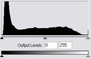 Параметры раздела Входные уровни (Input Levels) используются для установки новых значений белой и черной точек изображения, что позволяет сократить диапазон яркостей изображения и повысить его контрастность. Для этой цели можно воспользоваться перемещением находящихся под диаграммой треугольников либо ввести численные значения в соответствующие поля ввода. Например, установка в левом поле значения 30 приведет к тому, что все цвета, имеющие значение яркости меньше этой величины, станут черными, и соответственно ввод значения 220 в правом поле приведет к обращению в максимум всех яркостей в диапазоне 220-255. В результате диапазон яркостей исходного изображения понизится с 255 до 195, а контрастность возрастет.