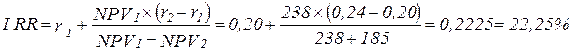 3) Зная, что r1 = 20%, r2 = 24%, а NPV1=238, NPV2 =-185 рассчитаем IRR, отражающую граничную величину ставки дисконта, выше которой проект становиться убыточным: