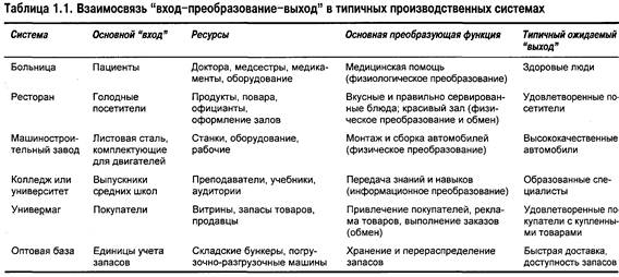 Несомненно, перечисленные выше преобразования не являются взаимоисключающими. Так, например, супермаркет одновременно позволяет покупателю (1) сравнивать цены и качество предлагаемых им товаров (информационное преобразование), (2) хранить определенные товары на складе до тех пор, пока в них не возникнет необходимость (складирование), и (3) продавать товары (обмен). В табл. 1.1 представлены примеры взаимосвязей типа "вход—преобразование—выход" самых разных производственных систем. Обратите внимание на то, что в ней указаны только основные ресурсы системы. Более полное описание включало бы также управленческие и вспомогательные функции.