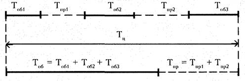 В целом производственный цикл Тц состоит из длительности производственных операций (технологических, контрольных, грузово-разгрузочных, транспортных, складских, естественных и др.) — назовем ее временами обработки Тоб, а также перерывов, предопределенных созданием запасов, работой партиями, неравномерностью производства, межпеременными и другими перерывами и тому подобное — назовем их временами пролеживания Тпр.