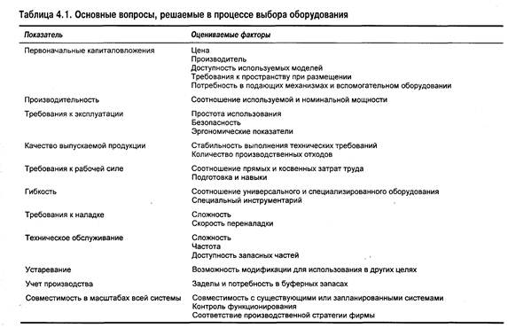 После того как компания выбрала тип производственного потока, она должна подобрать оборудование для его оснащения. В табл. 4.1 перечислены некоторые основные факторы, которые следует учитывать в ходе принятия такого решения.