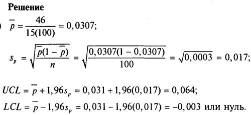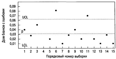 Из 15 выборок две выходят за контрольные границы. Поскольку контрольные границы были установлены на уровне 95%, или 1 дефектный бланк из 20, мы можем сказать, что данный процесс вышел из-под контроля. Его необходимо исследовать и обнаружить причину такого большого разброса.