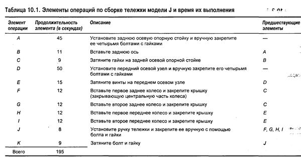 На конвейере собирается модель тележки J. В день необходимо изготовить 500 штук. Суммарное время выполнения oопераций – 420 минут, элементы сборочных операций и их продолжительности приведены в табл. 10.1.