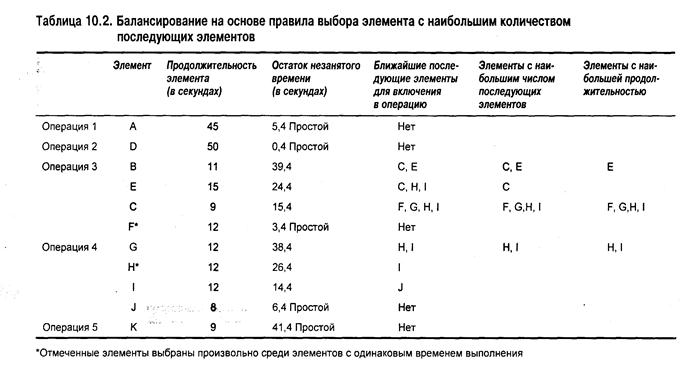 5. Затем в соответствии с правилом "b" нужно последовательно, начиная с элементов A и В, среди элементов с наибольшим числом последующих элементов находить наиболее продолжительный элемент и включать его в состав операции. Такие последовательные манипуляции нужно продолжать до тех пор, пока суммарное время выполнения элементов не станет равным или несколько меньшим длительности такта. Отобранные элементы войдут в рассматриваемую операцию. Затем из оставшихся элементов аналогичным образом формируют последующие операции до полного исчерпания элементов. Эти манипуляции для примера представлены в табл. 10.2.