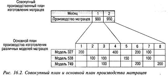 Рассмотрим пример планирования выпуска трех типов матрасов в мебельном производстве. В верхней части рис. 16.2 показан совокупный план производства общего количества матрацев, запланированного на месяц, без учета типов матраца. В нижней части показан основной план производства с указанием конкретного типа матраца и количества матрацев, запланированного на каждую неделю. На следующем, более низком уровне (не показан) должна находиться MRP-программа выпуска, в которой разрабатываются подробные календарные планы, показывающие, когда именно для изготовления матрацев понадобится хлопчатобумажная обивка, пружины и деревянные каркасы.