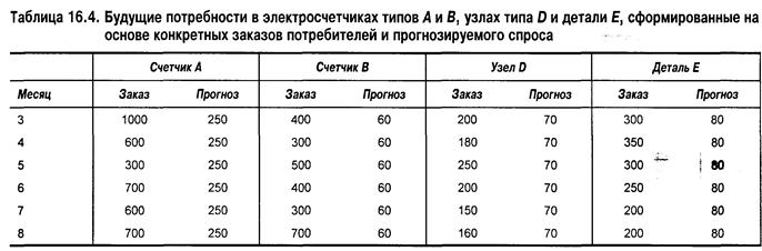 Потребность в электрических счетчиках и компонентах формируется из двух источников – постоянных потребителей, которые размещают твердые заказы, и случайных потребителей, которые обычно делают произвольные заказы на эти изделия. Эти произвольные потребности прогнозируются на основе данных прошлого спроса с помощью одного из обычных методов, описанных в главе 13. В табл. 16.4 представлена потребность в электрических счетчиках типов А и В, узлах типа D и детали Е на шестимесячный период (месяцы с 3-го по 8-й включительно).