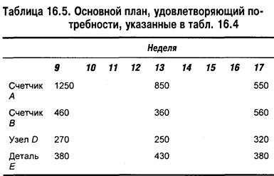Допустим, количества электросчетчиков и компонентов, указанные в табл. 16.4, необходимые для удовлетворения известного спроса, должны поставляться на протяжении месяца в соответствии с графиками поставок потребителям, а изделия, необходимые для удовлетворения прогнозируемого спроса, должны быть готовы уже в первую неделю месяца.
