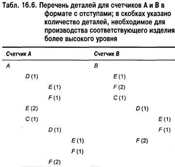 В табл. 16.6 показан перечень необходимых элементов в формате с отступами, соответствующий структуре счетчиков типов A и В. Как уже указывалось в этой главе, для облегчения вычислений все элементы в ВОМ-файле указаны без использования отступов, однако распечатка с отступами нагляднее демонстрирует способ сборки изделия.