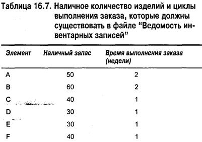 Файл "Ведомость инвентарных записей" в нашем примере аналогичен тому, который показан на рис. 16.7. Разница, как мы уже отмечали в этой главе, состоит в том, что настоящий файл "Ведомость инвентарных записей" содержит много дополнительных данных: наименование поставщика, затраты и время выполнения заказа. В нашем примере данные, содержащиеся в файле "Ведомость инвентарных записей", представляют собой наличный запас на момент начала выполнения программы и циклы выполнения заказов. Будем считать, что эти данные взяты из файла "Ведомость инвентарных записей" и показаны в табл. 16.7.