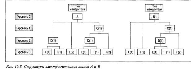 Структура продукта для электрических счетчиков типов А и В представлена на рис. 16.8 типовым способом – с помощью кодирования нижнего уровня, когда каждый элемент помещается на самый нижний уровень, на котором он появляется в иерархии данной структуры. Электрические счетчики типов А и В состоят из двух узлов – С и D, а также двух деталей – Е и F. Числа в скобках указывают количество, требуемое для производства соответствующего изделия более высокого уровня.