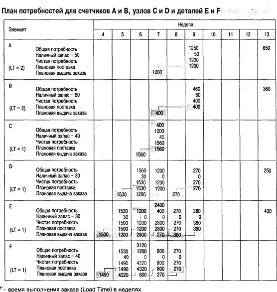 Поскольку в запасе есть 50 готовых счетчиков А, необходимо изготовить еще 1200 счетчиков А. Чтобы получить счетчики А на 9-й неделе, заказ нужно разместить на 7-й неделе, так как необходимо 2 недели на выполнение заказа. Такая же процедура касается счетчика В (выдача заказа на 400 счетчиков В планируется на 7-ю неделю).