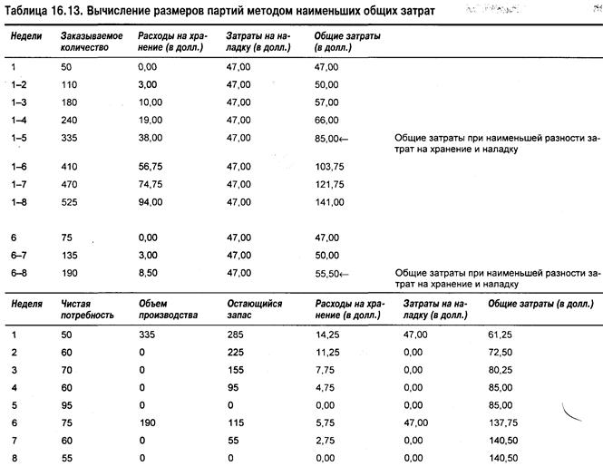1-й недели для удовлетворения потребностей 1-й и 2-й недели; производство в течение 1-й недели для удовлетворения потребностей 1-й, 2-й и 3-й недели и т.д. Правильным выбором будет размер партии, при котором затраты на наладку и расходы на хранение примерно равны. В табл. 16.13 оптимальный размер партии равен 335, поскольку расходы на хранение, составляющие $38, и затраты на наладку, составляющие $47, оказываются ближе, чем $56,25 и $47 ($9 против $9,25). Этот размер партии отвечает потребностям недель с 1-й по 5-ю. Таким образом, это метод в принципе аналогичен методу EOQ, но в отличие от него, размер партии в этом случае охватывает только целые количества периодов.
