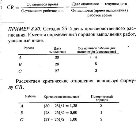 Критическое отношение дает приоритет работам, которые должны быть выполнены, чтобы не нарушить расписание отгрузки. Работа с низким критическим отношением (меньше 1,0) является работой, выпадающей из расписания, отстающей. Если CR в точности равно 1,0, работа находится в границах расписания. CR больше чем 1,0 означает, что работа опережает расписание и время ее выполнения не напряженно.Выражение для определения критического отношения имеет следующий вид: