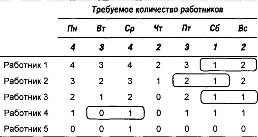 Поскольку первого работника мы могли назначить на все семь дней, обведем рамкой два последовательных дня с наименьшей потребностью (с наименьшими числами). Эти дни будут считаться выходными первого работника. Парой дней с наименьшей потребностью является та, у которой большее число в паре не превышает большего числа в любой другой паре. Это гарантирует, что дни с наибольшими потребностями будут обеспечены требуемым персоналом. Можно выбрать понедельник и воскресенье, несмотря на то, что они находятся в разных неделях.