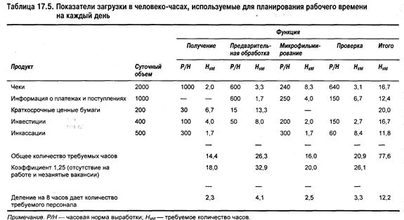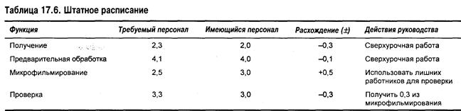 Для решения этой задачи необходимо выполнить суточный прогноз потребности по каждому "продукту" и для каждой "функции". Полученный результат преобразуется в рабочие часы, требуемые для выполнения каждой отдельной функции, которые в свою очередь преобразуются в потребность в рабочей силе (число работников, требуемых для выполнения каждой отдельной функции). Затем полученные величины сводятся в таблицы, суммируются и корректируются с учетом отсутствия на работе (по тем или иным причинам) требуемых работников и незаполненных вакансий. В результате получается плановое количество рабочих часов. Затем эти показатели делятся на продолжительность рабочего дня, в результате чего мы получаем количество требуемых работников. На основе этих данных можно определить дневную потребность в человеко-часах, пример расчета которой приведен в табл. 17.5. Полученные результаты становятся основой для составления плана рабочего времени отдела, в котором должны быть перечислены требуемые работники, работники, имеющиеся в наличии, разница между этими величинами и действия, которые собирается предпринять руководство для устранения дефицита, вызванного этой разницей (табл. 17.6).