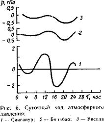 Суточный ход давления хорошо выражен в тропиках, где его амплитуда может достигать в среднем 3–4 гПа (рис. 6). От тропиков к полюсам амплитуда суточных колебаний убывает. На широте 60 °, например, амплитуда будет измеряться только десятыми долями гПа и суточные колебания здесь перекрываются и маскируются несравненно более значительными непериодическими колебаниями, вызванными изменившимися условиями погоды.