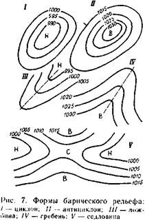 Изолинии равного атмосферного давления на приземных синоптических картах – изобары – имеют весьма разнообразную конфигурацию: от прямолинейных и параллельных одна по отношению к другой на отдельных участках до замкнутых концентрических систем округлой или овальной форм с низким или высоким давлением в центре. Эти барические системы основных типов называют циклонами и антициклонами.