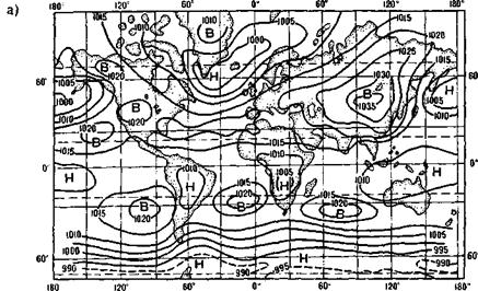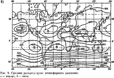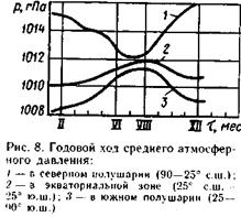 Полярность сезонов в полушариях Земли приводит к тому, что средняя величина атмосферного давления над каждым из них меняется от зимнего полугодия к летнему (рис. 8). Вследствие этого происходит сезонный обмен воздуха между полушариями (преимущественно в высоких слоях атмосферы). Подсчитано, что за год из северного полушария в южное и обратно переносится около 1013 т воздуха, что составляет 1/500 часть всей массы атмосферы.