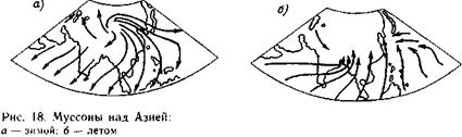Особенно ярко выражена муссонная циркуляция в бассейне Индийского океана, где сезонные изменения температуры полушарий здесь усилены огромным материком Евразии к северу от экватора, прогретым летом и сильно охлажденным зимой. Зимний муссон в бассейне Индийского океана называют северо-восточным, а летний – юго-западным. На востоке Китая и в Корее зимний муссон – северный или северо-западный, а летний – южный или юго-восточный. Это зависит от структуры барического поля и направления изобар и, следовательно, направления барических градиентов (рис. 18).