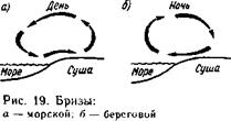 Бризовая циркуляция объясняется перестройкой барического поля днем и ночью над сушей и морем. Термическая неоднородность моря и суши приводит к смене направления барических градиентов и, следовательно, к смене направления ветра (рис. 19).