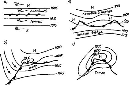 а – малоподвижный фронт на приземной карте погоды; 6 – волновые возмущения на малоподвижном фронте; в – образование циклона на стационарной малоподвижном фронте; г – молодой циклон