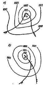 Возникновение на поверхности главных фронтов огромных волн с длинами порядка 1000 км и более может привести к разрыву температуры и ветра на фронте, а отклоняющая сила вращения Земли, действующая на воздушные потоки, способствует зарождению мезомасштабных вихрей – циклонов и антициклонов. При этом фронтальная поверхность и линия фронта на поверхности Земли испытывают волнообразные деформации. На одних участках (в гребнях волн) фронт отклоняется к низким широтам, а на других (в долинах фронтальных волн) – к высоким широтам. Воздушные течения при этом теряют зональный характер и возникают языки холодного и теплого воздуха – участки холодного и теплого фронтов. В долинах фронтальных волн развиваются циклонические движения и давление падает – образуются циклоны. Центральные части циклонов располагаются непосредственно на фронте, и фронт, таким образом, проходит через внутренние области циклонов. В передней части циклона фронт смещается к высоким широтам и имеет характер теплого фронта. В тыловой части циклона фронт перемещается к низким широтам и имеет характер холодного фронта. В то же время оба они являются участками одного и того же главного фронта. Свойственные фронтам системы облаков и осадков возникают и развиваются на соответствующих участках бывшего малоподвижного стационарного фронта (рис. 28).