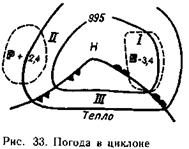 Наиболее типичный циклонический характер погоды выражается в молодом циклоне. В этом случае выделяют три зоны с резко отличающимися условиями погоды (рис. 33). Зона I – передняя и центральная части циклона. Погодные условия здесь обусловливаются холодной устойчивой воздушной массой и приближающимся теплым фронтом. При быстром углублении циклона и значительной влажности воздуха образуются слоисто-дождевые облака (Ns), нередко захватывающие вершину теплого сектора, из которых выпадают интенсивные обложные осадки. Зимой в таких случаях может наблюдаться резкое ухудшение видимости, а летом возможна гроза. При низких значениях влажности воздуха облачная система не успевает полностью развиться, поэтому осадки в этом случае менее интенсивны и чаще носят моросящий характер.