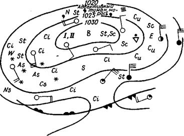 Во внетропическом антициклоне различают шесть типов погоды (рис. 34).