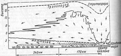 Рис. 50. Вертикальный разрез через тропический циклон (от центра циклона к одной его периферии).