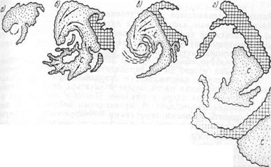 В связи с тем, что пространственная ось тропического циклона почти строго вертикальна, можно принимать положение центра облачного вихря за положение центра циклона у поверхности моря. Положение облачного вихря и его центра определяется сравнительно легко, так как даже в начальной стадии тропический циклон характеризуется изолированным сплошным облачным массивом. На рис. 51 схематически показана деформация облачных систем в процессе эволюции тропического циклона.