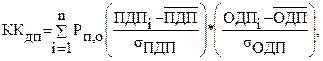 где ККдп - коэффициент корреляции положительного и отрицательного денежных потоков во времени; Рп,о - прогнозируемые вероятности отклонения денежных потоков от их среднего значения в плановом периоде; ПДП i - варианты сумм положительного денежного потока в отдельных интервалах планового периода; ПДП -средняя сумма положительного денежного потока в одном интервале планового периода; ОДП i - варианты сумм отрицательного денежного потока в отдельных интервалах планового периода; ОДП - средняя сумма отрицательного денежного потока в одном интервале планового периода; s ПДП , sОДП - среднеквадратическое (стандартное) отклонение сумм денежных потоков (соответственно - положительного и отрицательного).