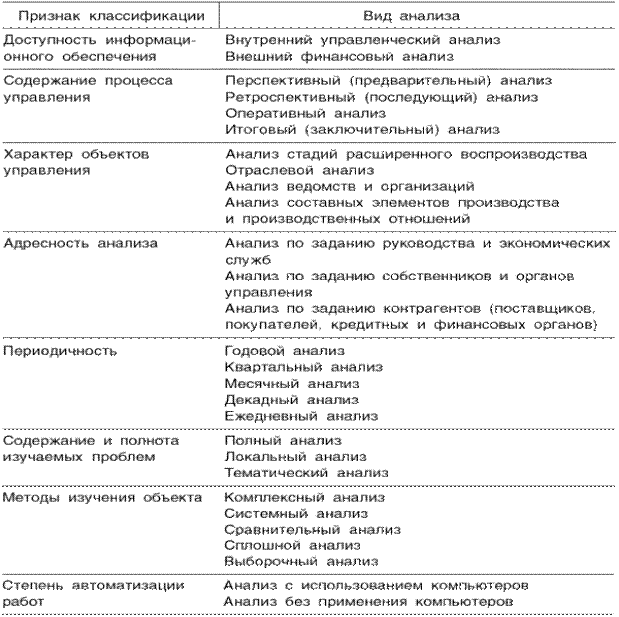 В зависимости от потребностей в его проведении и результатах экономический анализ имеет множество оснований для классификации его видов (табл. 1).