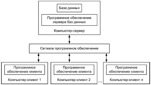 Информационные системы с клиент-серверной архитектурой позволяют избежать проблем файл-серверных приложений. При такой архитектуре сервер базы данных, расположенный на компьютере-сервере, обеспечивает выполнение основного объема обработки данных. Клиентское приложение формирует запросы к серверу базы данных, как правило, в виде инструкций языка SQL. Сервер извлекает из базы запрошенные данные и передает на компьютер клиента. Главное достоинство такого подхода — значительно меньший объем передаваемых данных.