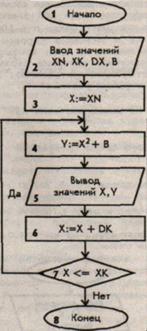 Введем обозначения: XN - начальное значение Х; ХК - конечное значение Х; DX - шаг изменения величины Х; Х - текущее значение величины Х; Y- значение функции Y; В - значение константы b.