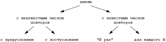 Цикл организуют по определенным правилам. Циклический алгоритм состоит из подготовки цикла, тела цикла, условия продолжения цикла