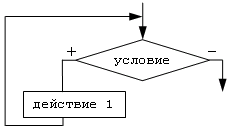 Выполнение цикла "пока" начинается с проверки условия, поэтому такую разновидность циклов называют циклы с предусловием. Переход к выполнению действия осуществляется только в том случае, если условие выполняется, в противном случае происходит выход из цикла. Можно сказать что условие цикла "пока" - это условие входа в цикл. В частном случае может оказаться что действие не выполнялось ни разу. Условие цикла необходимо подобрать так, чтобы действия, выполняемые в цикле, не привели к нарушению его истинности, иначе произойдет зацикливание. Зацикливание - бесконечное повторение выполняемых действий.