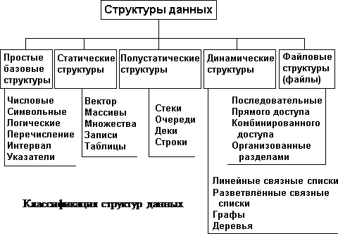 В языках программирования понятие "структуры данных" тесно связано с понятием "типы данных". Любые данные, т.е. константы, переменные, значения функций или выражения, характеризуются своими типами. Информация по каждому типу однозначно определяет: