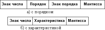 Формат для представления чисел с плавающей точкой содержит одно или два поля фиксированной длины для знаков. Количество позиций для значащих цифр различно в разных ЭВМ, но существует, тем не менее, общий формат, приведенный на рисунке 2.5 а). В соответствии с этой записью формат вещественного числа содержит в общем случае поля мантиссы, порядка и знаков мантиссы и порядка.