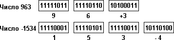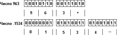 Внутримашинное представление данного типа носит название десятичного упакованного формата. Примеры представления чисел 963 и -1534 в таком формате приведены на рис. 2.6.
