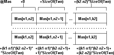 Адресом массива является адрес первого байта начального компонента массива. Смещение к элементу массива Mas[i1,i2] определяется по формуле:
