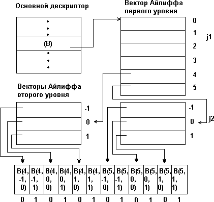 На рис. 3.4 приведена физическая структура трёхмерного массива В[4..5,-1..1,0..1], представленная по методу Айлиффа. Из этого рисунка видно, что метод Айлиффа, увеличивая скорость доступа к элементам массива, приводит в то же время к увеличению суммарного объёма памяти, требуемого для представления массива. В этом заключается основной недостаток представления массивов с помощью векторов Айлиффа.