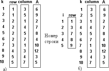 Доступ к элементу массива A с индексами i и j выполняется выборкой индекса i из вектора ROW, индекса j из вектора COLUM и значения элемента из вектора A. Слева указан индекс k векторов наибольшее значение, которого определяется количеством нефоновых элементов. Отметим, что элементы массива обязательно запоминаются в порядке возрастания номеров строк.
