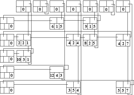 На рис. 3.7 приведена многосвязная структура, в которой используются вершины такого типа для представления матрицы А, описанной ранее в данном пункте. Циклический список представляет все строки и столбцы. Список столбца может содержать общие вершины с одним списком строки или более. Для того, чтобы обеспечить использование более эффективных алгоритмов включения и исключения элементов, все списки строк и столбцов имеют головные вершины.