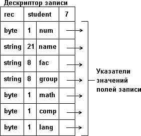 б) в виде связного списка с указателями на значения полей записи. При такой организации имеет место быстрое обращение к элементам, но очень неэкономичный расход памяти для хранения.