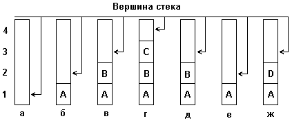 Некоторые авторы рассматривают также операции включения/исключения элементов для середины стека, однако структура, для которой возможны такие операции, не соответствует стеку по определению. Для наглядности рассмотрим небольшой пример, демонстрирующий принцип включения элементов в стек и исключения элементов из стека. На рис. 4.1 изображены состояния стека: