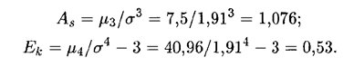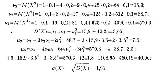 Затем вычисляем начальные и центральные моменты 2, 3 и 4-го порядков и среднее квадратическое отклонение (см. формулы (18.27)-(18.31)):