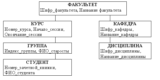 В иерархических моделях данных используется ориентация древовидной структуры от корня к листьям. Графическая диаграмма схемы базы данных называется деревом определения. Пример иерархической базы данных приведён на рис.2.4.